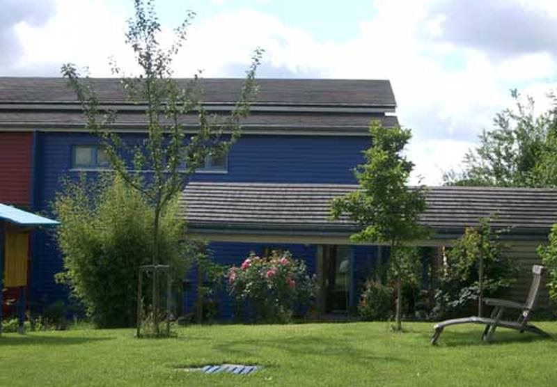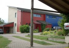 5 Einfamiliehäuser wurden in einer ortstypischen Hofanlage mit zentralem Erschließungsplatz für private Baufamilien im Bergischen Land, 30 km östl. von Köln 1997/98 errichtet. Die Häuser sind unterschiedlich groß, nicht unterkellert und exakt südorientiert. Für dieses Projekt wurden vom Planer einige Neuerungen entwickelt und hier als Pilotprojekt realisiert: die „Holzwerkstoff-Monocoque-Konstruktion“, die Anwendung und Vorfertigung aus TJI-Stegträgern, in die Lüftungsanlage integrierte Flüssiggas-Warmluft-Kleinstheizung, Solar-Tragkonstruktion an den Südfassaden mit mehreren Funktionen, wärmebrückenfreie Türaustrittkonstruktionen, u.v.m. Die Häuser werden seit 1998 von den gleichen Familien bewohnt. |
