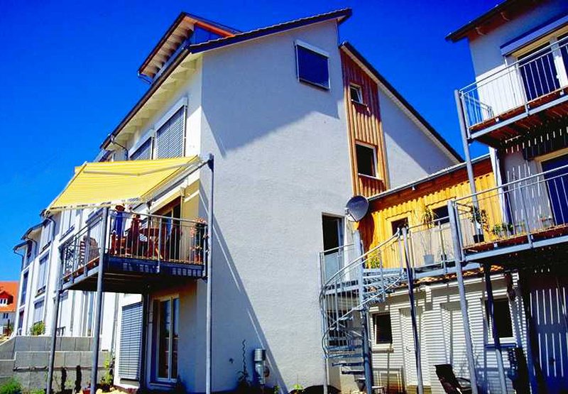 Kompakter Baukörper, tragende Struktur aus neu entwickelter Holzwerkstoff-Monocoque-Konstruktion der 2. Generation, Großtafelbauweise, höchste Maßhaltigkeit, Massivkeller im Niedrigenergiehausstandard, Nebengebäude mit Garage und Kellerraum
